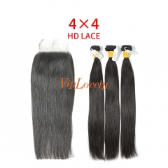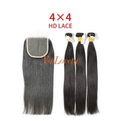 HD Lace Raw Human Hair Bundle with 4×4 Closure Straight